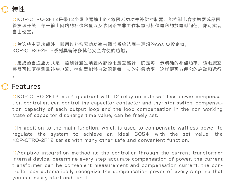 除这些主要功能外,即用以补偿无功功率来调节系统达到一理想的cos Ф设定值,KOP-CTRO-2F12系列具备许多其他安全方便的功能。